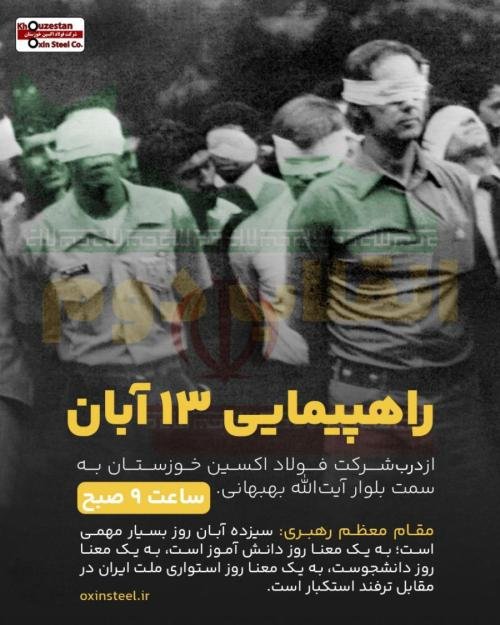 در سالروز یوم الله ۱۳ آبان و روزملی مبارزه با اسکتبار جهانی، فولاد مردان شرکت فولاد اکسین خوزستان در جمع گسترده و پرشور مردم اهواز و راهپیمایی ۱۳ آبان حاضر خواهند شد و فریاد «مرگ بر آمریکا» و «مرگ بر اسرائیل» سر خواهند داد.